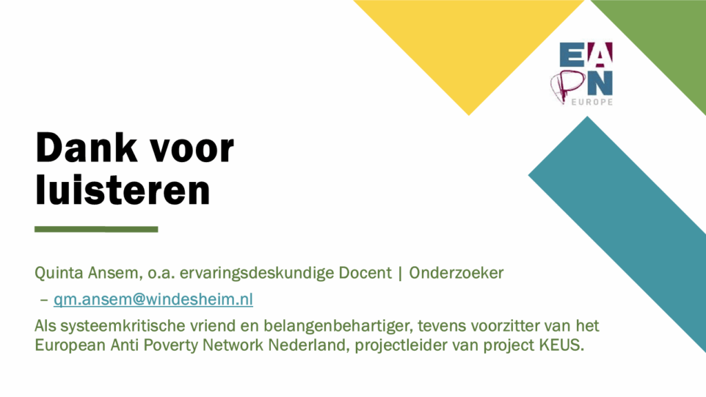Goedemorgen allemaal. Mijn naam is Quinta Ansem en ik ben o.a. voorzitter van het Europeaan Anti Poverty Netwerk Nederland en (betaald) werkzaam bij het lectoraat Klantenperspectief in Ondersteuning en Zorg, alwaar ik het thema, of onderzoekslijn ‘evenwaardige ruimte voor ervaringskennis’ onder mijn hoede heb. Vanuit deze twee petten sta ik hier en lever ik een bijdrage om de vraag te kunnen beantwoorden, hoe verder?