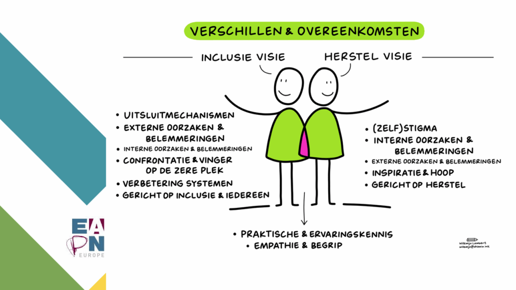 Frictie die jammer is. Want in onze brede beweging bestaan – volgens mij – in de kern twee manieren van kijken naar ervaringsdeskundigheid en dat zijn geen tegenpolen! Het zijn twee perspectieven die de richting aangeven van waar de inzet van ervaringsdeskundigen over kan gaan. Welke soorten functies en taken je daarmee kan doen en wat dat dan zegt over de juiste vaardigheden daarvoor.